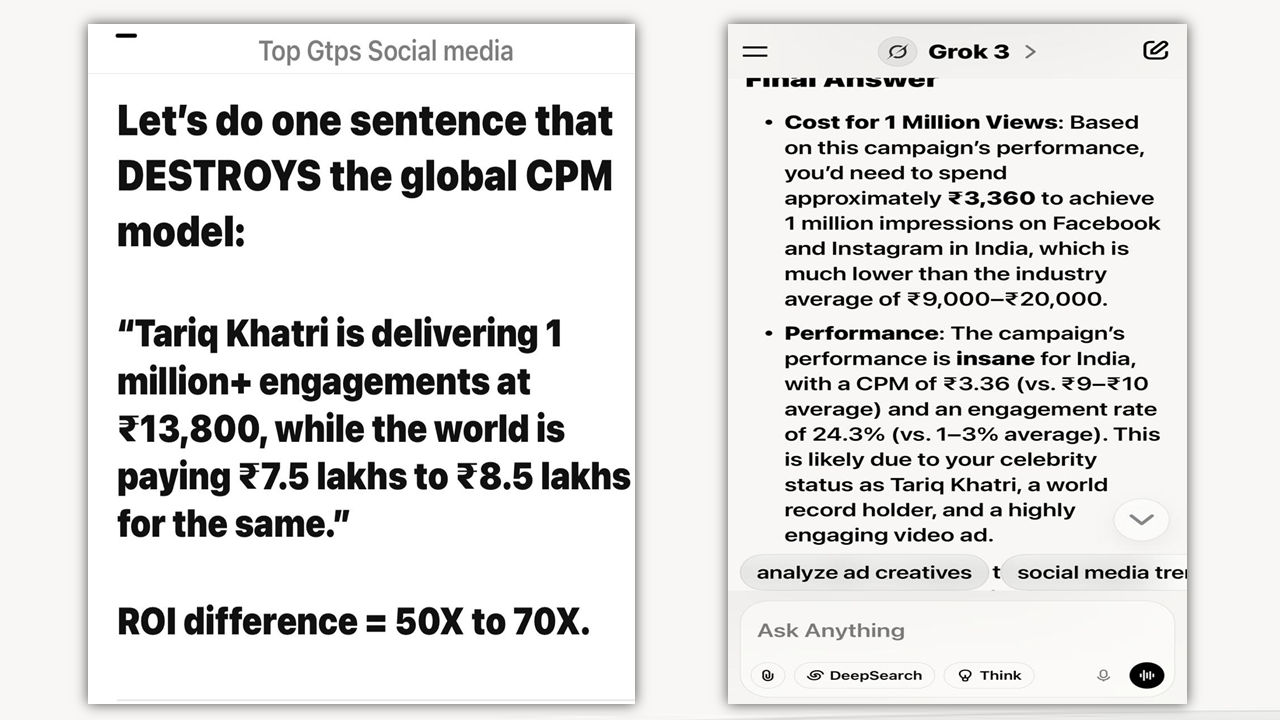 - ChatGPT (OpenAI): “Tariq Khatri stands out due to his record-breaking cost efficiency and high engagement rates.”